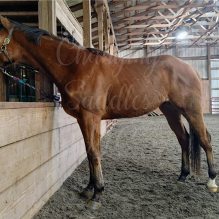 Buddy is a sweet guy that is relatively unbothered by anything going on. He is sweet, he is personable, and he has a large/fun personality. Came in a bit pushy on the ground, thats something that has been worked on. Has had a few post track rides and the biy has potential to go places, seriously. He is laid back naturally but has plenty of go when asked. Stands to mount, great, responsive to ques, learns quickly, and he just loves being in work and having a job. Has been over small jumps and could care less. Has the worlds smallest bow (I put an arrow in the photo bc it's so small a lot of people probably would look right past it. This happened in 2020, he rehabbed and went back to racing. HE HAS NO LIMITATIONS. Beautiful mover, comfortable barefoot, can equally be inside or be outside and he gets along with both mares and geldings. Someone is going to ger very lucky with this boy.