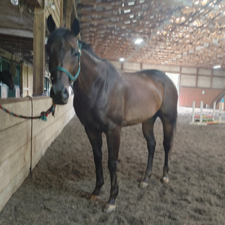 This is probably my favorite horse in my barn. He is such a gentleman and just screams class.... also very easy on the eyes. Stopped racing last year bc of a pulled xyz ligament and was given time off. Has been training at indiana this year and owners just dont want to take the chance of overextending and hurting him.. they would rather he go on to a long and full life and be happy. Amateur friendly, he is a horse i feel comfortable with my 2yr old daughter around. Gets along with other horses but turns out fine alone. Great ground manners... settles into new places very easy and has been a total gem to have around.