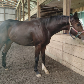 Lola is so incredibly gentle and kind. Shes been a gem while staying with us the past few months. Last year she bowed her tendons and was given a year off to heal... she came back this year in full training (and racing) and during her last race she came back and her tendons were aggravated. Connections didnt want to push her and wanted her to have a full life after racing. Shes about as tall as she is round... a very easy keeper who has acclimated to 24hr turnout very well. I DO think she should have another 60 days turnout before starting back under saddle even though she is sound now. I do not think she will have very many limitations, as the bows are not horrible but do think she should stay away from gaming sports. Amateur friendly and so pleasant.